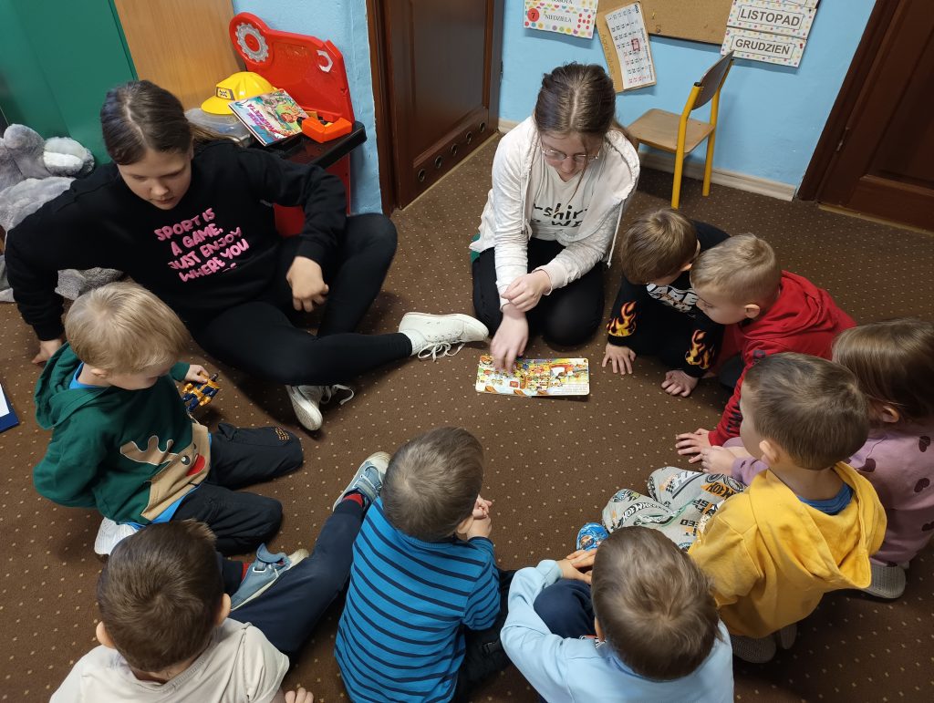 W naszym przedszkolu pojawili się wyjątkowi goście — starsi uczniowie, którzy w ramach projektu „Słowa mają moc” czytali naszym przedszkolakom bajki o przyjaźni, współpracy i dobrej komunikacji. Dzieci z wielką ciekawością słuchały historii, które pokazywały, jak ważne są: